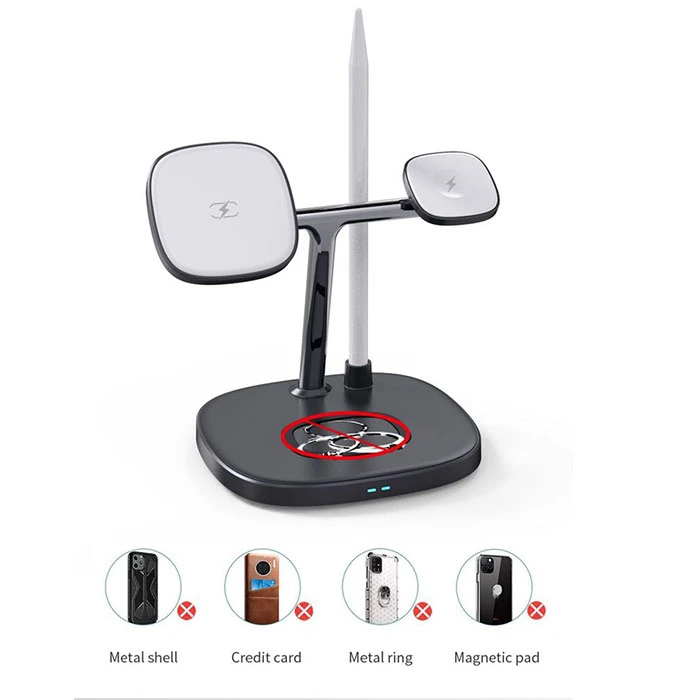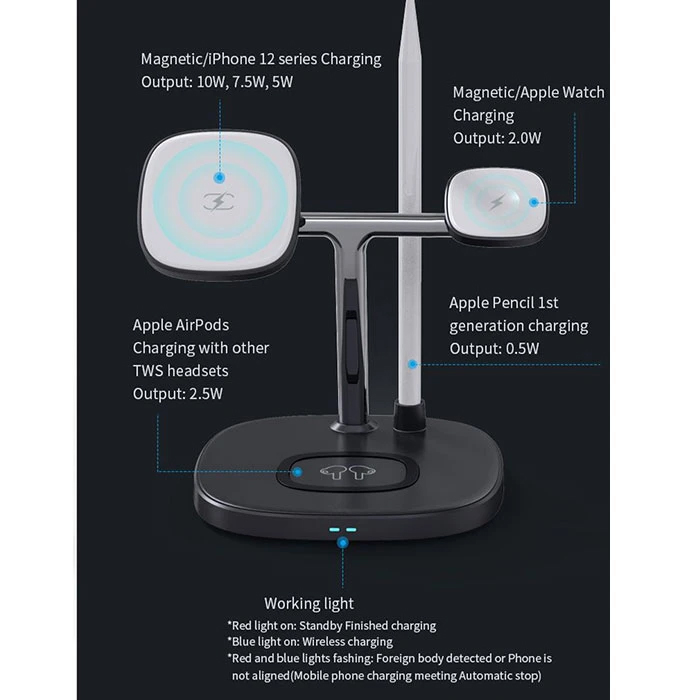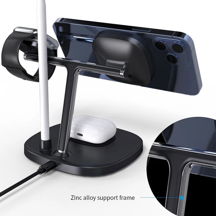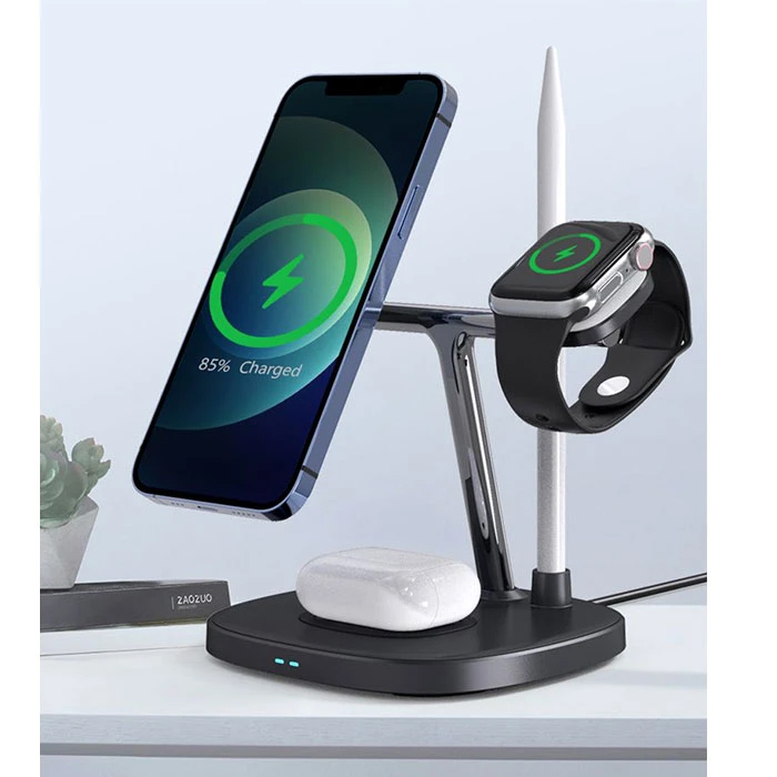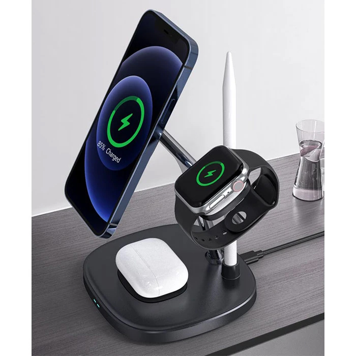 پایه نگهدارنده با قابلیت شارژ گوشی های آیفون سری های 12 به بعد ، اپل واچ و ایرپادهای اپل و قلم لمسی اپل که با کیفیت بسیار بالا تولید شده و لذت کارایی در کنار زیبایی را به شما میدهد . از قابلیت نگهداری گوشی به صورت عمودی و افقی در حین شارژو همچنین قابلیت چرخش پنل نگهدارنده گوشی که این محصول با کیفیت رو از سایر محصولات متمایز میکند. قابلیت شارژ گوشی با کاور ( کاورهای با ضخامت کمتر از 0.236 اینچ ) که این قابلیت را کمتر محصولی در بازار ایران دارد. درگاه ورودی این کالا USB type-C هست که امروزه بسیار پر مصرف شده است.